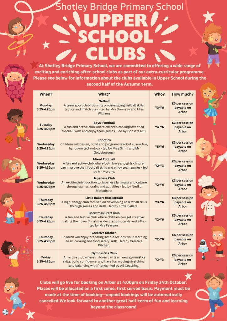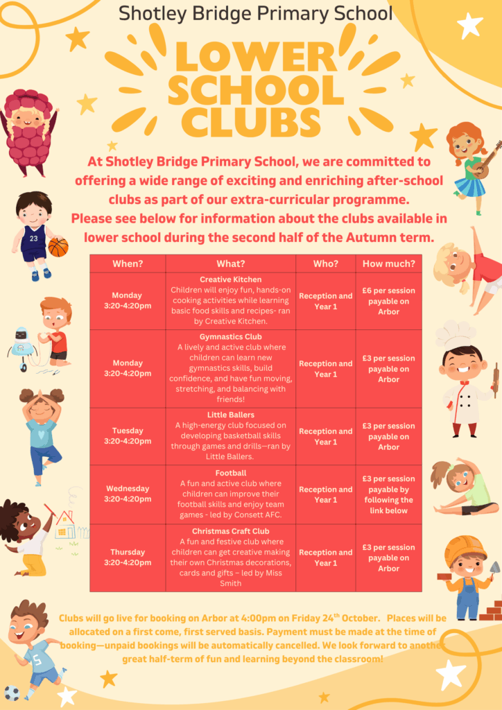 At Shotley Bridge Primary School our varied after‐school club programme offers something for every interest: budding athletes can join football, netball or games clubs to build teamwork and fitness, while creative spirits can explore seasonal crafts such as Christmas crafting clubs. Young linguists can embark on language adventures, with fun Japanese and Spanish sessions that bring new words to life through games and songs. While the chefs amongst us, don aprons to learn kitchen safety, measure ingredients and prepare simple, healthy snacks—from homemade bread to fruit tarts—fostering confidence, creativity and a taste for lifelong learning. One of our most popular clubs remains our own Musical Theatre Club, who work tirelessly throughout the year to rehearse and perform live on stage for our school community in our summer production!