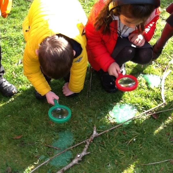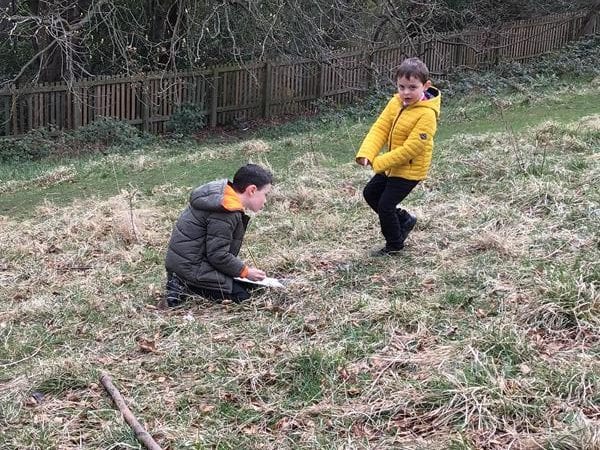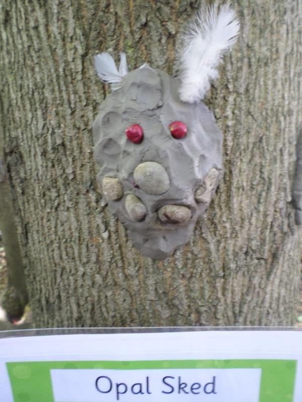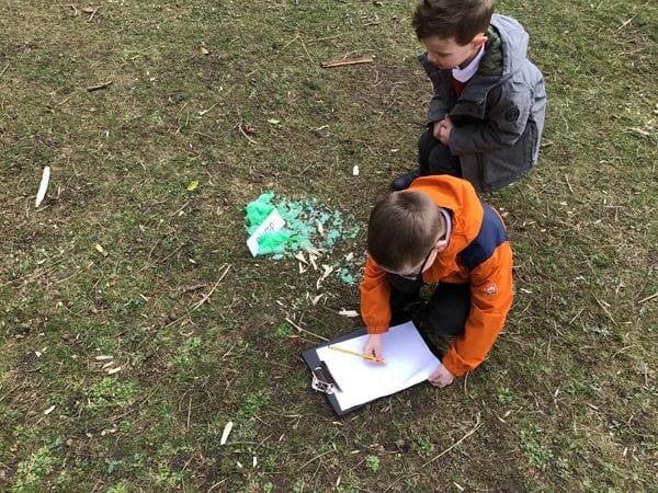 On Wednesday the children went back out to discover green slime around the UFO leading down into leaf land. They discovered lots of adjectives to describe the alien who must have crashed their UFO. One child thought it would be a good idea to leave adjectives to describe the children at Shotley Bridge Primary School in case the alien was scared of us, so we made a list and put it out for the alien to find.